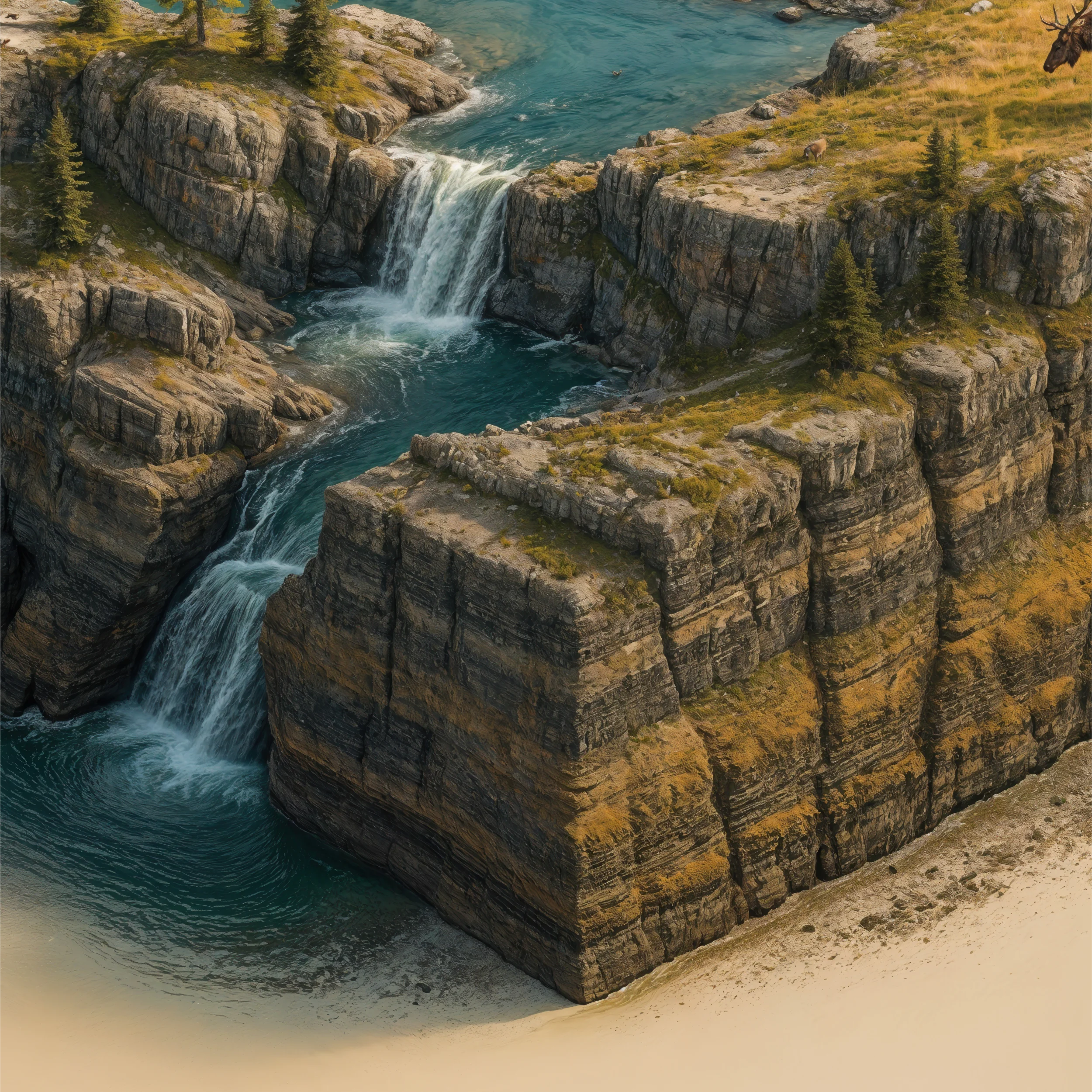 Rising above it all, the mountains stand quiet and eternal, their snow-lined crests catching the soft northern light. Below, the terrain slices away—revealing a meticulous cross-section of the land’s rugged geology, as if a mountaineer with a degree in earth sciences did the framing.