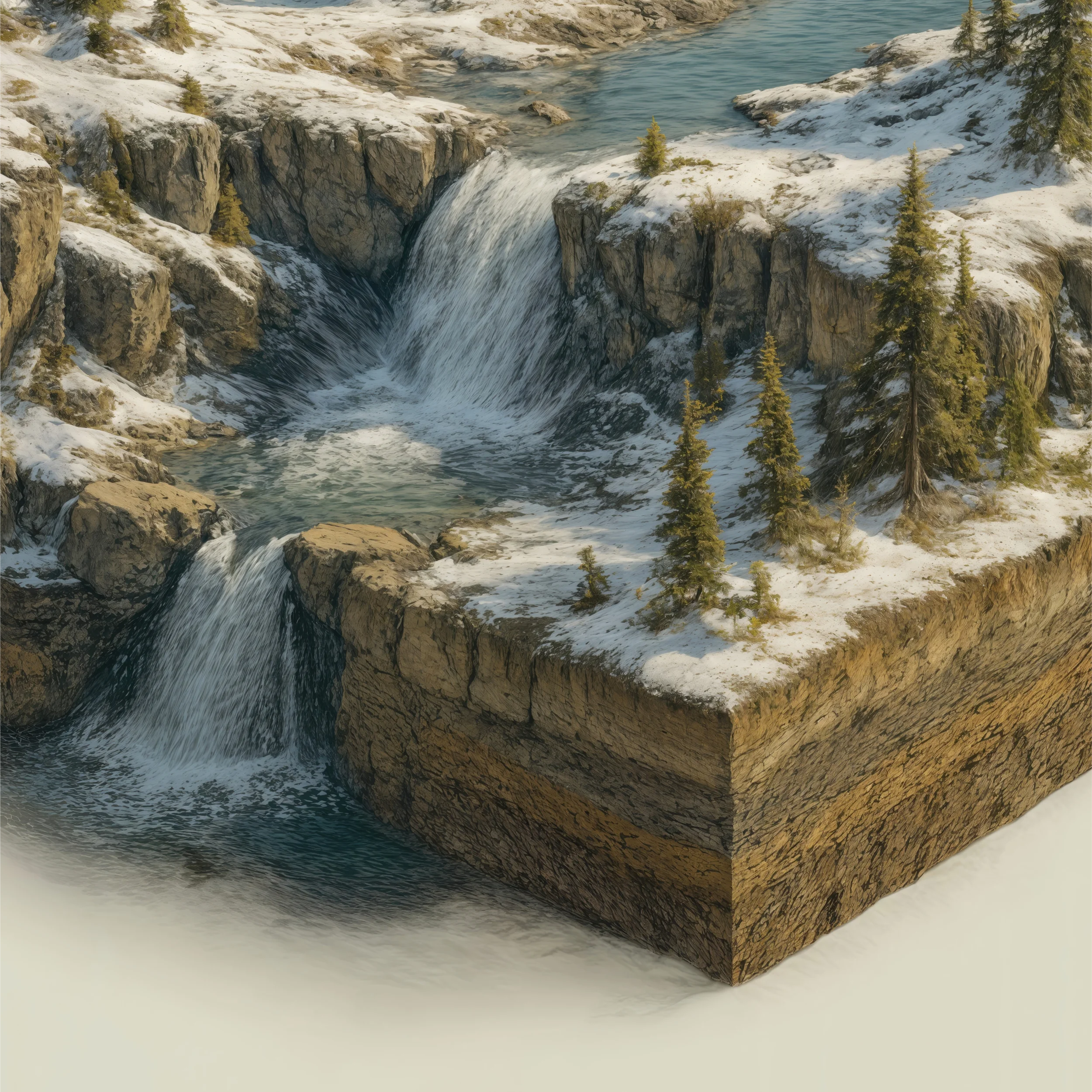 The snowy terrain cascades into icy waterfalls that tumble through a detailed geological cross-section below—because even beauty this still has layers. The forest stands stoic and dusted in frost, like an audience holding its breath before dawn. It’s winter, it’s wonder, and it’s wilderness, scaled to perfection.
