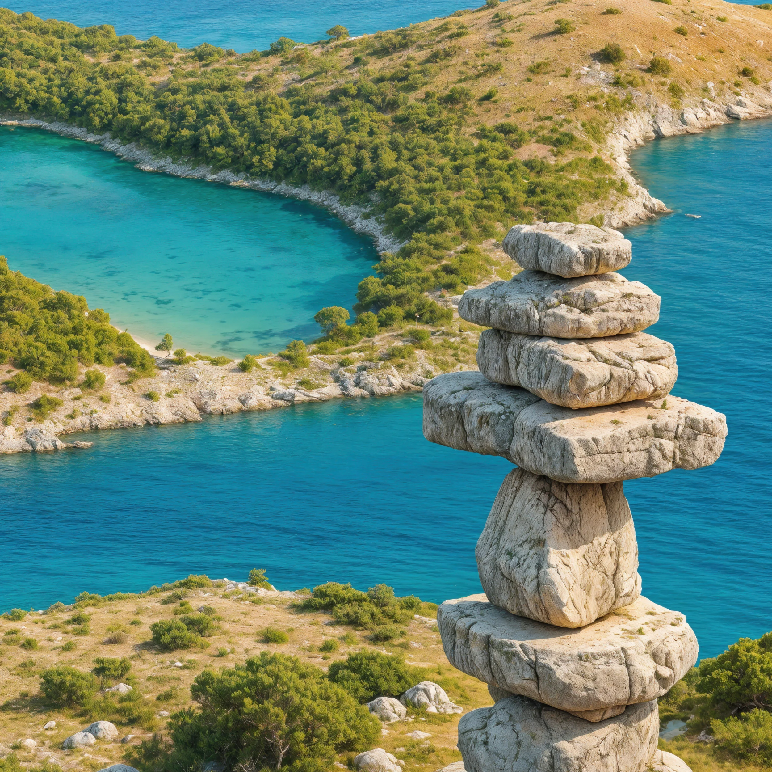 A rocky island rises from turquoise water, crowned by a tall dry-stone cairn, a nod to sailors and wayfarers. Behind it, more islands stretch toward the horizon, their limestone cliffs sheltering hidden coves and sea-lakes. The terrain cutaway reveals the weathered strata beneath, anchoring the scene in the geology that has shaped this nautical maze for millennia.