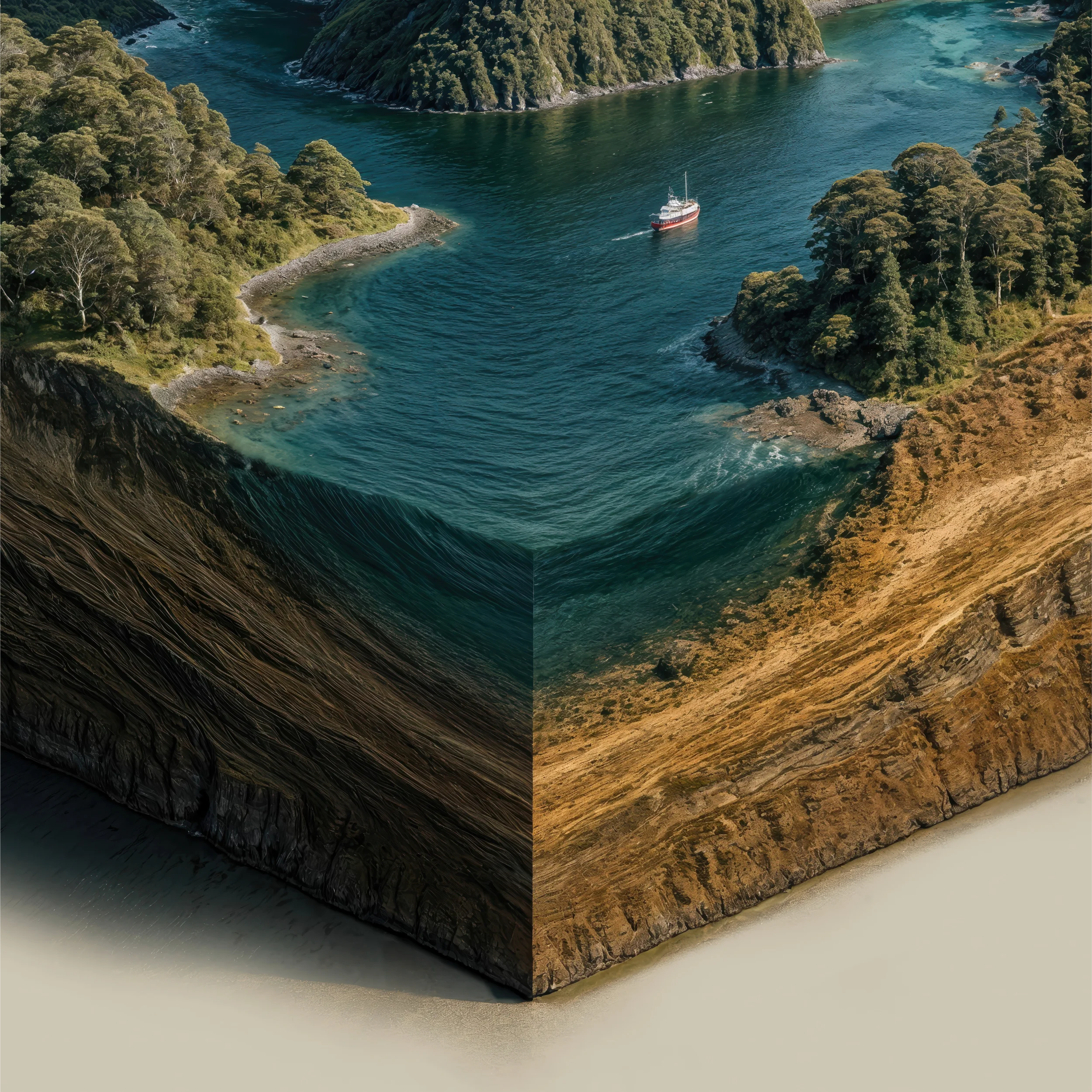 Sharp ridges rise defiantly from serene waters, waterfalls tumble over mossy cliffs, and a red-hulled boat navigates the inlet like a whisper in a cathedral. Below the surface, the earth itself has been sliced and laid bare, revealing the layered textures of time and tectonics.
