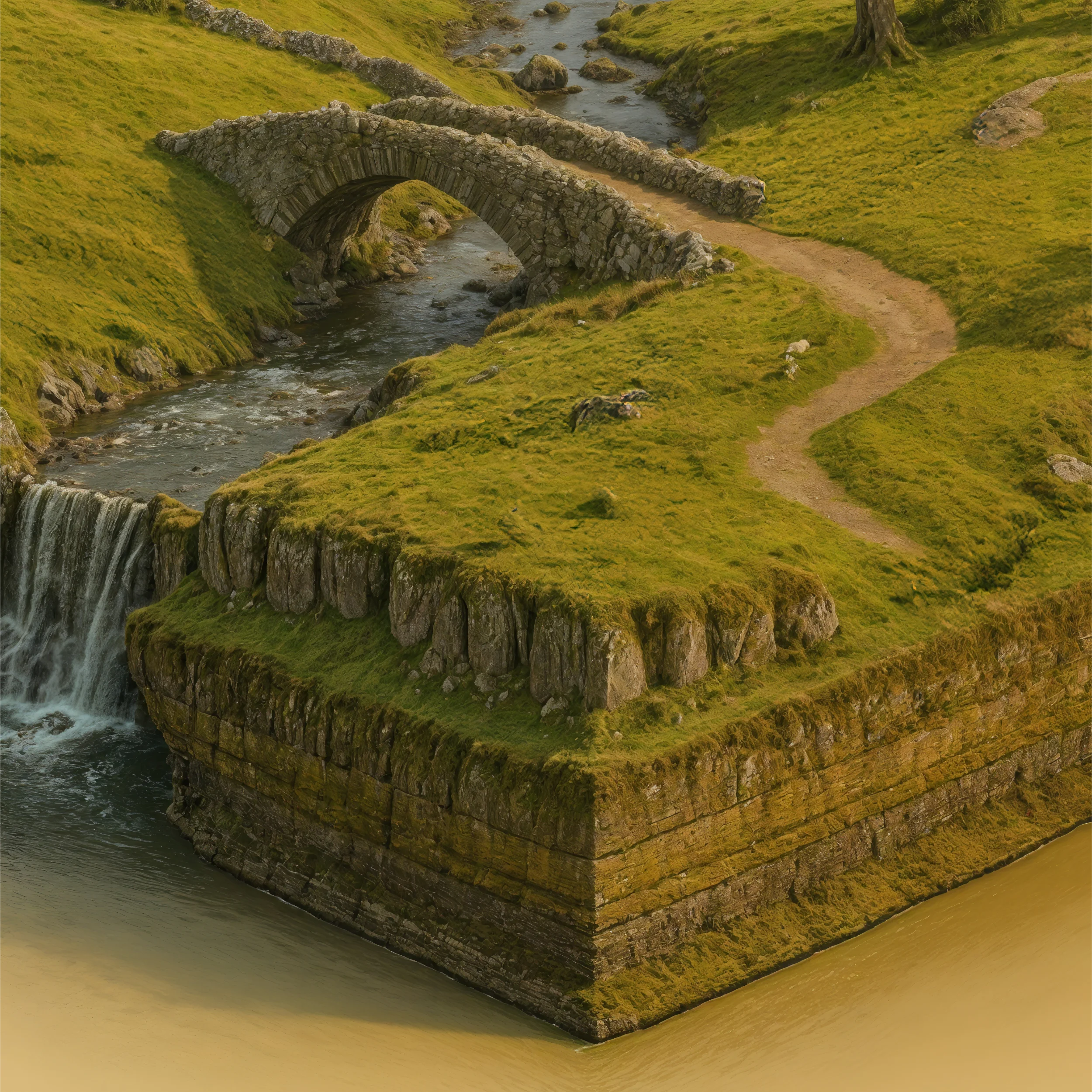 Golden-green hills rise gently above a shimmering lake, dotted with sheep and crowned by autumn trees. A small stone bridge arches over a stream, which tumbles down in a silver ribbon of water. The cutaway reveals the land’s foundations: ancient rock shaped by glaciers that carved the valleys into their present grace.