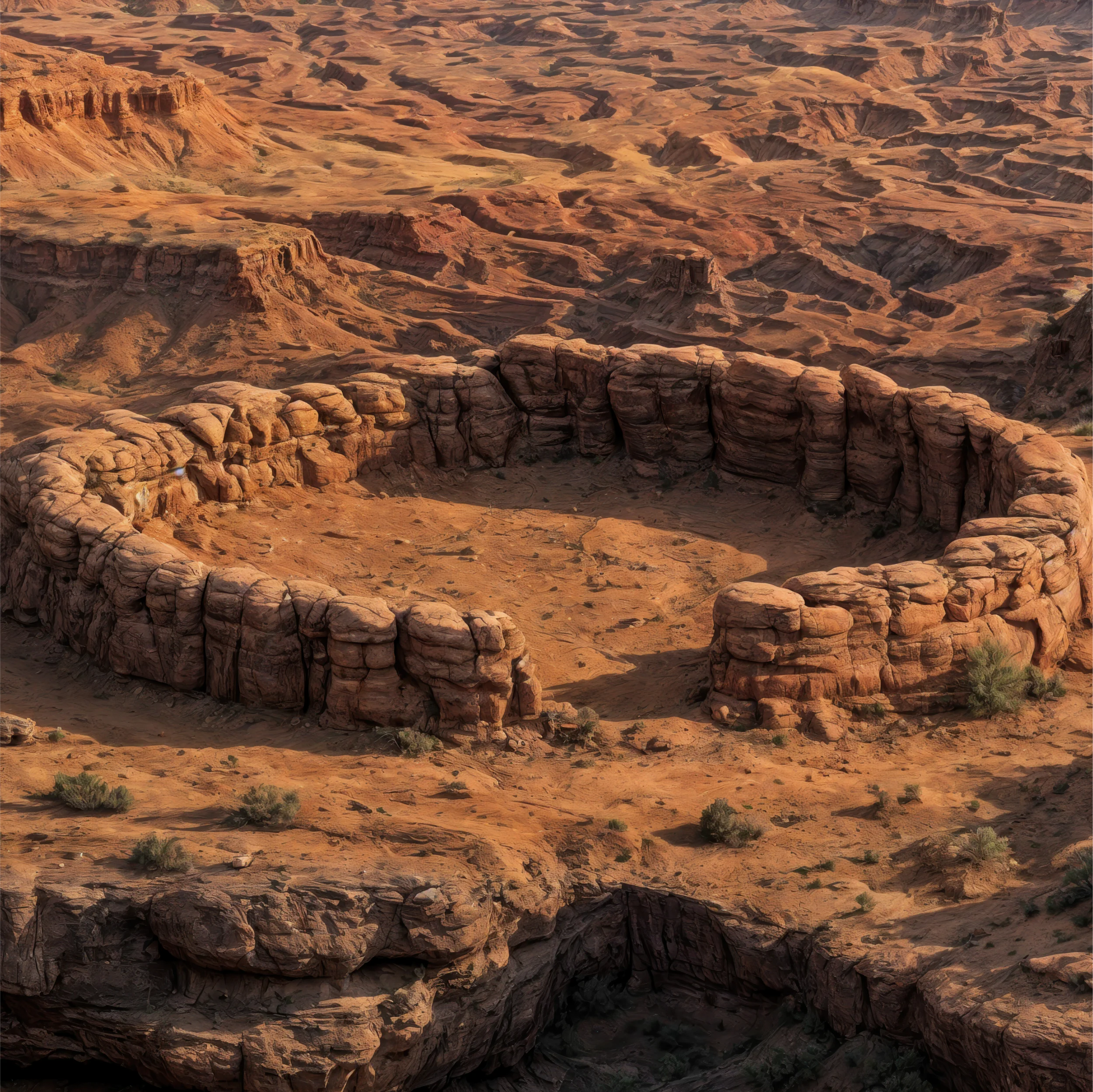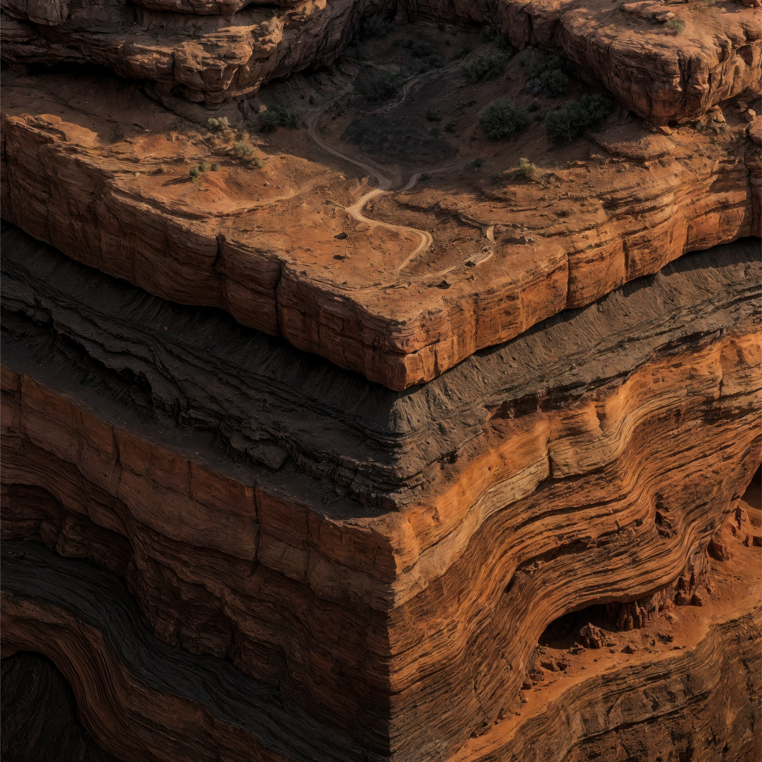 Towering mesas rise over a labyrinth of canyons, their walls banded with layers of red and ochre sandstone. At the top, a circular rock formation recalls both ancient ruins and nature’s patient sculpting. The cutaway reveals deep geological strata, etched over millions of years by rivers and relentless erosion.